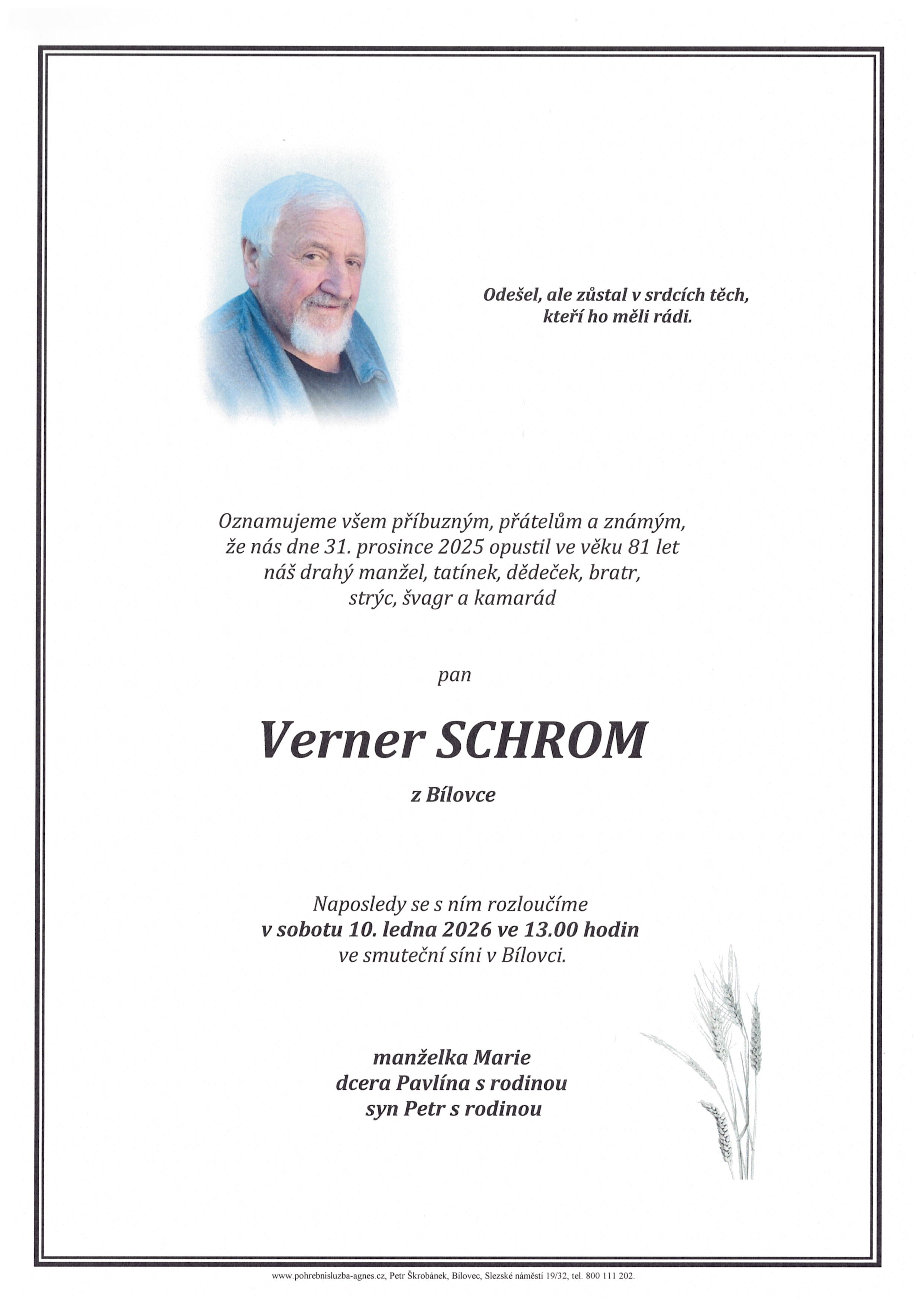 POHŘEBNÍ SLUŽBA PETR ŠKROBÁNEKSlezské náměstí 19/32, 743 01 Bílovec (sídlo firmy, fakturační adresa) IČ: 12655422, DIČ: CZ6605021203 č.ú.: 4011490349/0800 telefon: +420 556 410 810 e-mail: psagnes@seznam.cz ![]() | BEZPLATNÁ LINKA: +420 800 111 202NONSTOP LINKA: +420 603 519 090 |