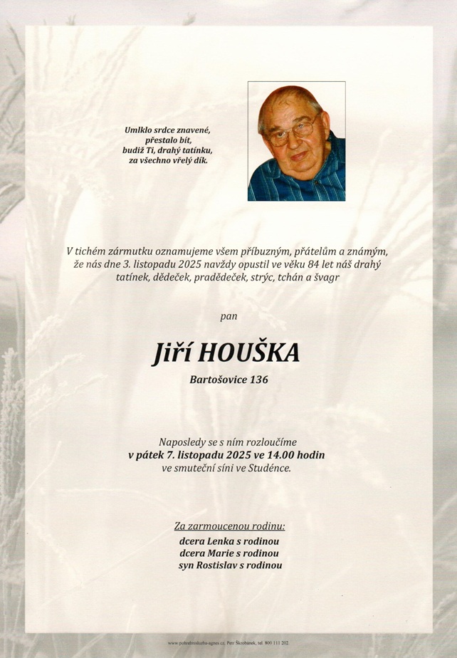 14.00 hodin Smuteční síň Studénka - Jiří Houška, 84 let