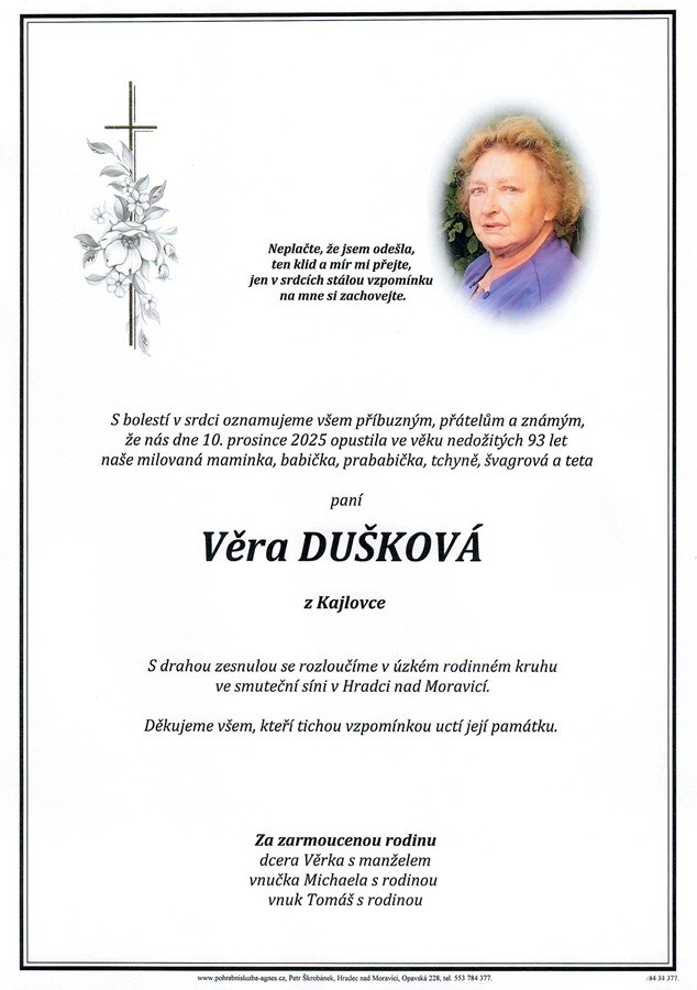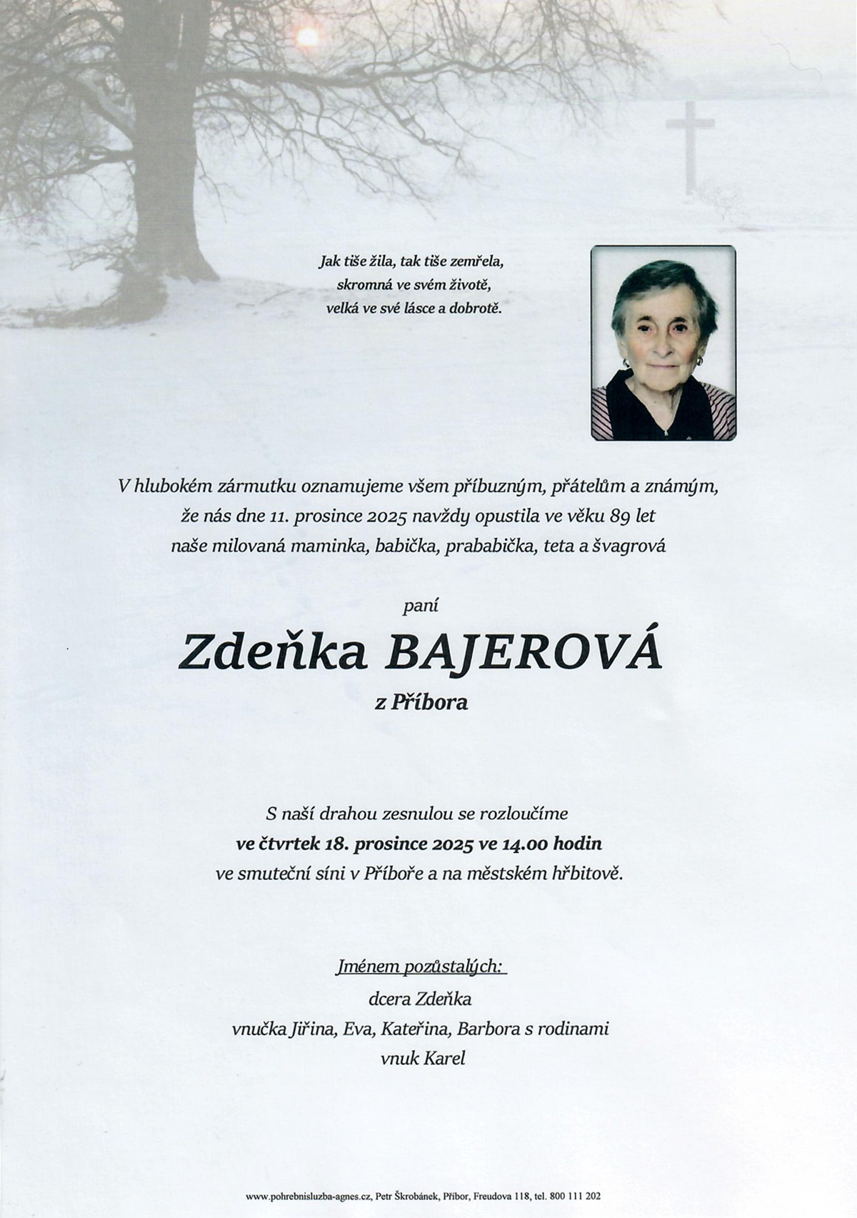 14.00 hodin Smuteční síň Příbor - Zdeňka Bajerová, 89 let