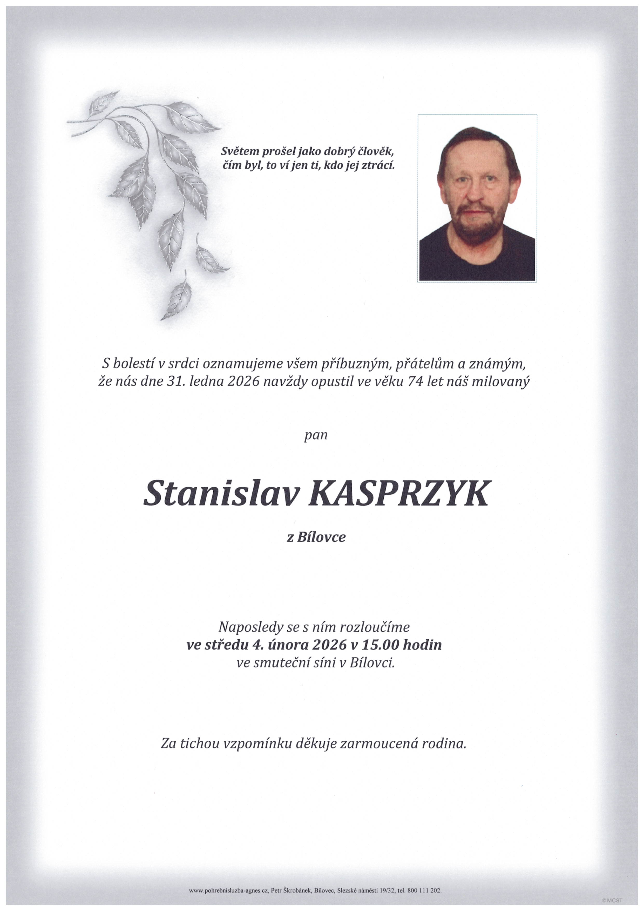 15.00 hodin Smuteční síň Bílovec - Stanislav Kasprzyk, 74 let