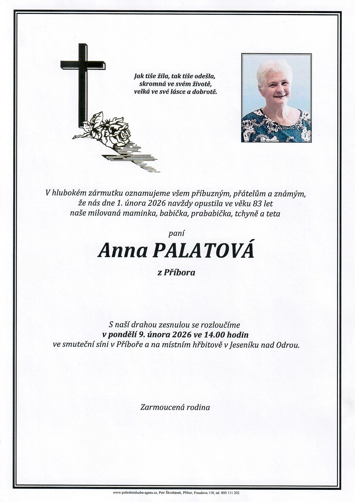 14.00 hodin Smuteční síň Příbor - Anna Palatová, 83 let