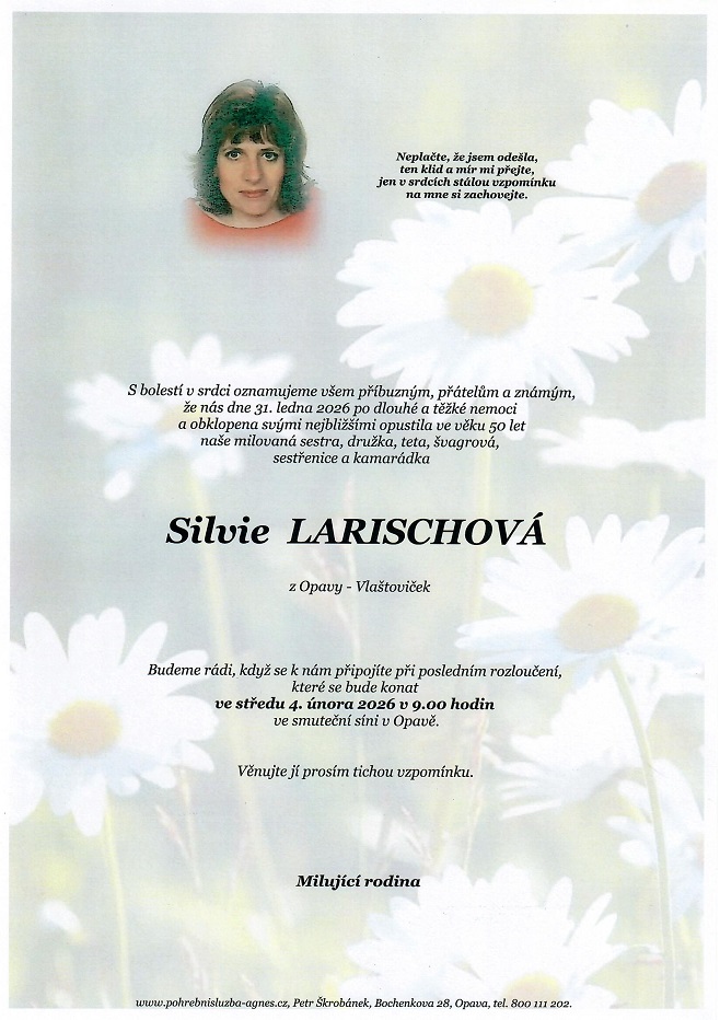 9.00 hodin Smuteční síň Opava - Silvie Larischová, 50 let
